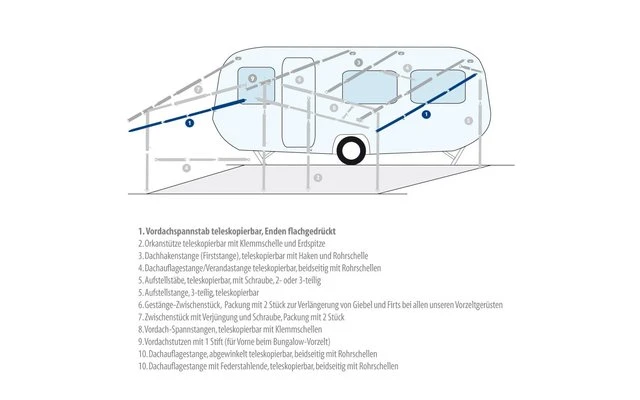 Barre de tension et barre faĂ®tière tĂ©lescopiques, extrĂ©mitĂ©s aplaties. Convient pour tendre l’avant-toit.