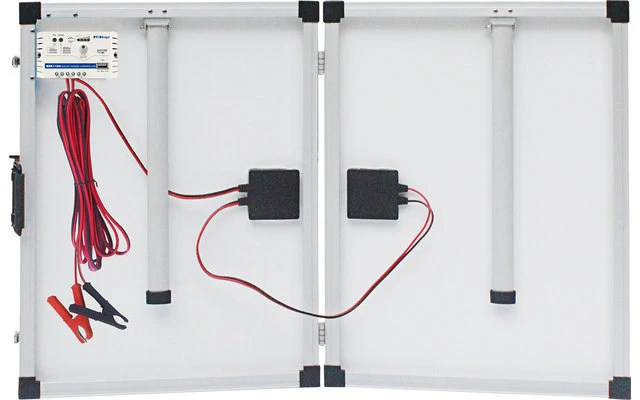 Cas exclusif d’équipement solaire. Déballez, dépliez et connectez les câbles. Mobile – produire de l’électricité facilement et partout. Gain de place grâce à la conception compacte et pliable. Applicable individuellement – convient à tous les types de piles. Résistant aux intempéries (IP44)