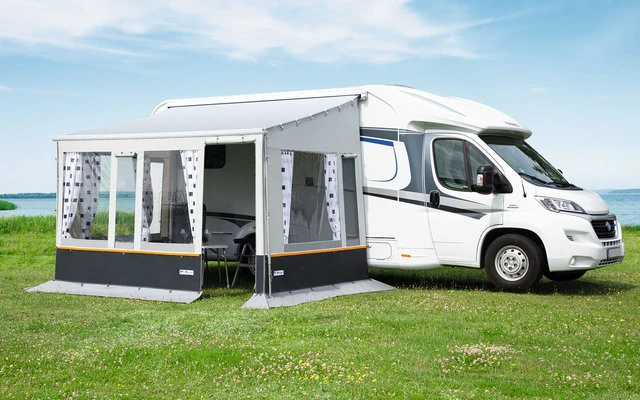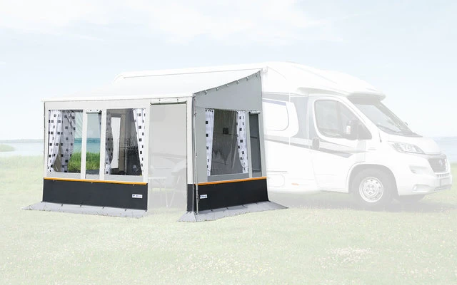 La paroi avant de l’auvent est conçue pour des largeurs d’auvent de 300 et 400 cm. Pour les autres largeurs, la paroi frontale peut être prolongée de manière appropriée à l’aide de l’élément d’élargissement. Convient aux auvents Thule série 5 et Fiamma F45.